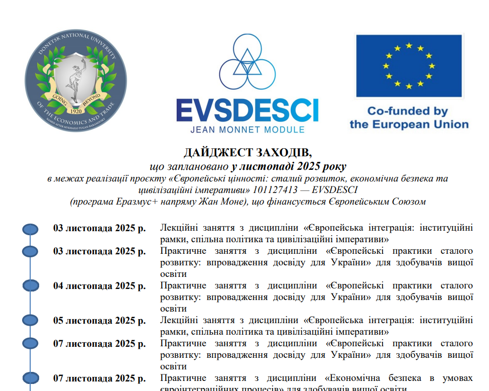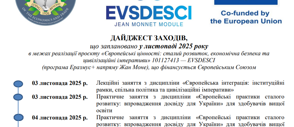 Команда проєкту «Європейські цінності: сталий розвиток, економічна безпека та цивілізаційні імперативи» 101127413 — EVSDESCI (програма Еразмус+ напряму Жан Моне), що фінансується Європейським Союзом, представила дайджест заходів, що заплановано у листопаді 2025 року.