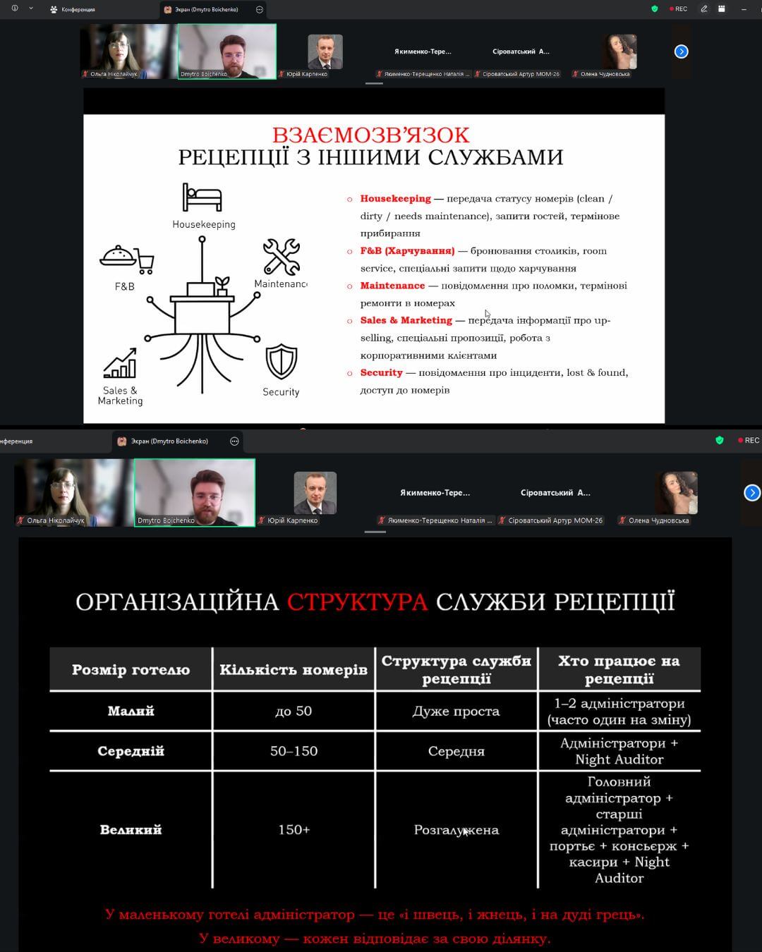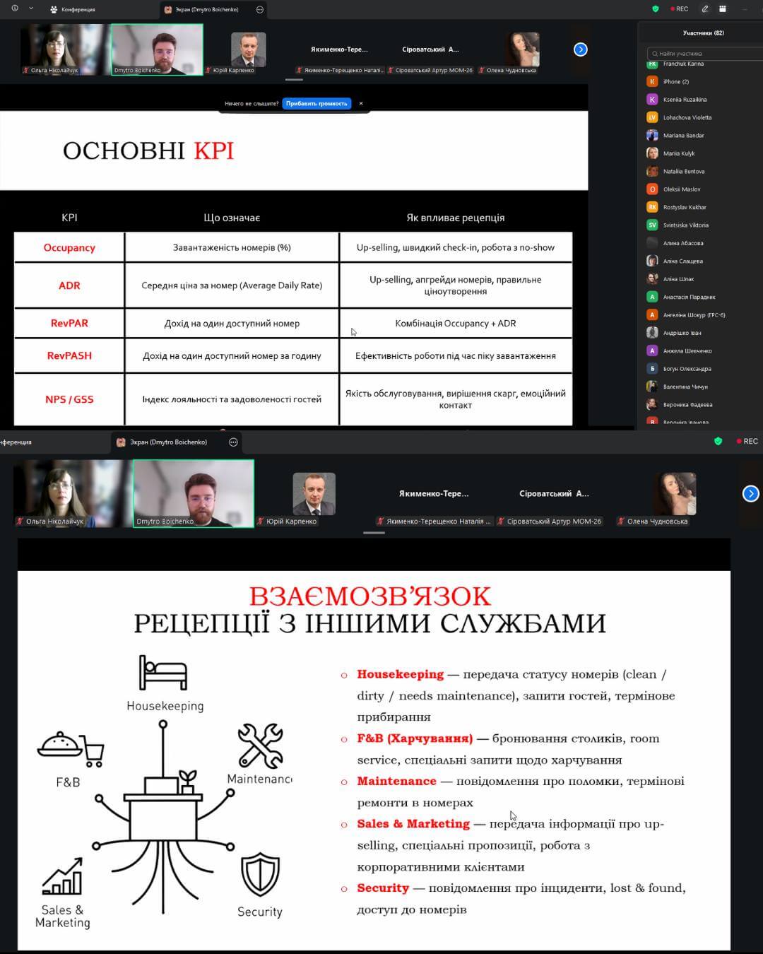 В рамках вебінару було проведено комплексний аналіз функціонування служби прийому та розміщення як важливої ланки в операційній структурі готельного підприємства. Спікер розкрив низку стратегічно важливих напрямів: